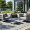 Flexibilität, Design und Bequemlichkeit haben sich bei dieser wunderschönen Lounge vereint. Mit einem einzigartigen Design der Rückenwand wirkt die Lounge wie eine Skulptur. Falls Sie den einsetzbaren Loungetisch dazu bestellen möchten, kann dieser an zwei Stellen, anstelle der Kissen integriert werden, sodass Sie die einzigartige Rückenwand der Lounge auch von vorne sehen können. Die Abrundung ist «links» oder «rechts» bestellbar. Die grosse Lounge ist mit Sunbrella Stoff überzogen und der quick dry Schaumstoff sorgt dafür, dass Sie auch nach langem Regen schnell wieder im Trockenen sitzen können. Der bräunliche Loungekorpus ist mit den silbrigen Kissen sehr harmonisch und passt sich somit einem gräulichen wie auch bräunlichen Untergrund an.